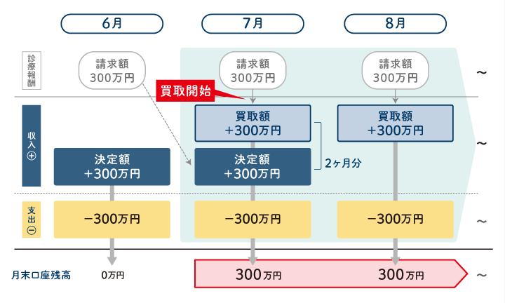 例えば、7月から買取を開始すると早期現金化により、実質2カ月分の診療報酬月額が確保できます。
