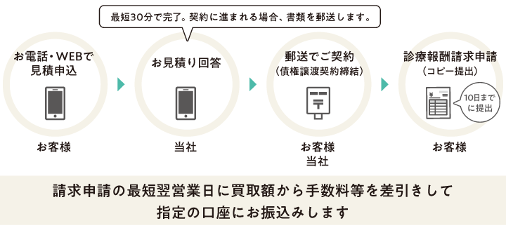※前払いされる金額は診療報酬請求額に買取率(最大100%)を乗じた額から手数料を差引きした金額となります。