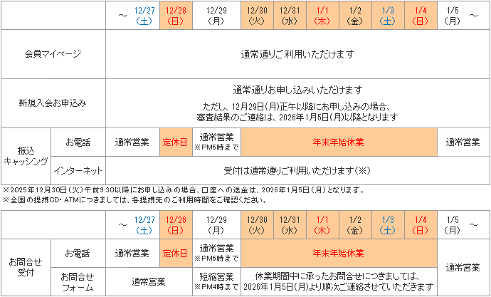 平素はn,カードJCBをご利用いただきありがとうございます。当社では、年末年始の営業につきまして、下記のとおり一部業務をお休みさせていただきます。
