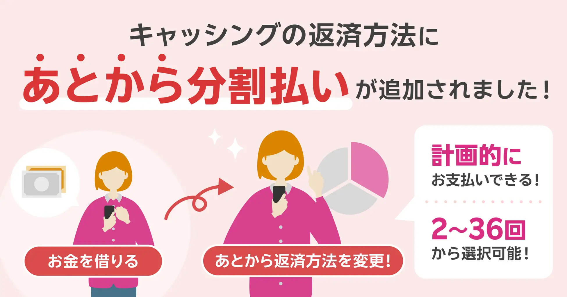 これまでキャッシングの返済方法は「1回払い」または「リボ払い」の2択でした。1回払いを選んだ後に支払い負担を軽くしたい場合は「あとからリボ払い」への変更しか選択肢がなく、返済回数を自分で細かくコントロールする手段が限られていました。今回の新機能追加により、より計画的な返済が実現しやすくなります。